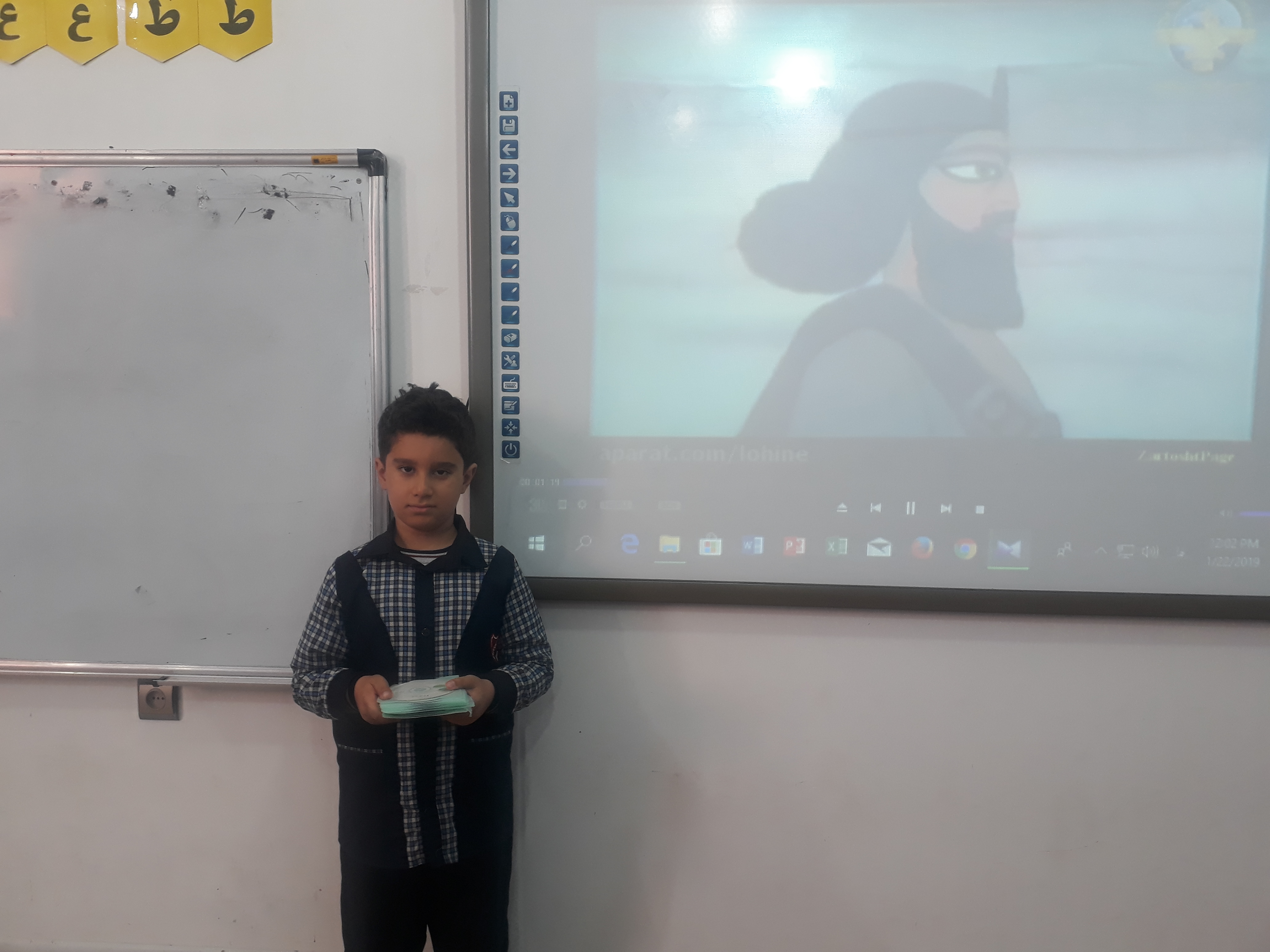 زنگ ششم : نمایش فیلم یکی از داستان های شاهنامه که پسر خوبم مهراد کاید عزیز برای دوستانش تهیه کرده بود . همچنین مجموعه داستان های شاهنامه را روی CD به دوستانش هدیه داد.